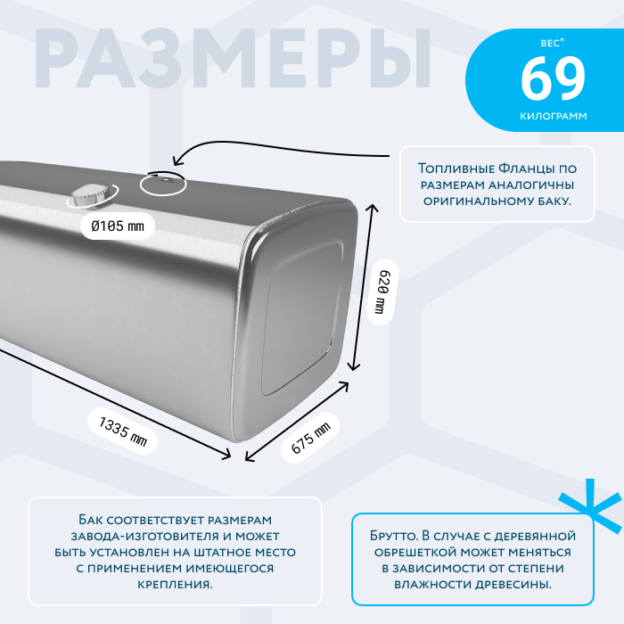 - Так же, если вы приобретаете алюминиевый топливный бак, он будет в деревянной обрешетке (для усиления защиты при транспортировке). При просчете веса и объема, цена за доставку может измениться по факту взвешивания на самом терминале транспортной компании. Так как деревянная обрешетка соответственно изготовлена из древесины, и она имеет свойство значительно набирать вес в зависимости от влажности окружающей среды.